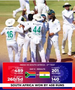 when the last day’s play started, India had 27-2 wickets down and the spinners of Africa made it difficult for the Indian batsmen only R jadeja made 50 runs overall. Within no time, one Indian batsman was coming and getting dismissed.under, 100 runsIndia lost six batsmen had returned to the pavilion. South Africa was dominating this test match. simon harmer spinner picked up five wickets in this innings. Indian batting was seen struggling in this test match. Indian team was all out for 140 runs and South Africa won this test match and this series by 2-0 What a wonderful victory they achieved. Africa won by 408 runs Marco Jansen was player of the match one interesting fact about
