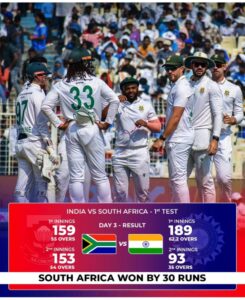 South Africa under the leadership of temba bavuma (c)  winning test matches continuously at home and away South Africa last series played in Pakistan Lahore and Rawalpindi two match test series Pakistan won the first test Lahore and South Africa 2nd test at Rawalpindi that was an interesting series series one all both the teams points on the table but no result series bend it of a drawn but South Africa captain temba bavuma (c) not in this series South Africa captain in India for preparing for the first test in Kolkata Eden garden cricket stadium so the test series start on a very tricky pitch Africa batting first and just managed 159 runs on the bord innings best score 31 by Aiden Markram seems like struggle in the first innings that not a good score at all in international level and the Indian spinners dominance Shawn on the first day of the test match India come into bat Indian batting struggling just like Africa on this turning track batsman comes and goes then not playing the spinners of touring team Simon Harmer taking 4/30 keep Africa in the game Indian innings come in to close just 189 runs with the best score of KL Rahul 39 runs now this test match is evenly poised both the teams thinking a win South Africa come out to bat in there 2nd innings and once again struggling with the bat Africa all out for just 153 runs with the help of captain innings Temba Bavuma 55 runs now India chase this target 123;of won the Kolkata test